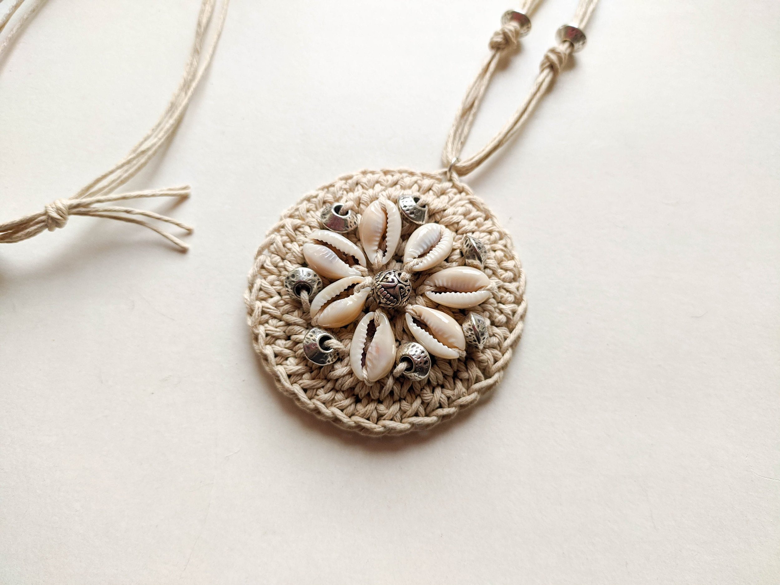 Large crochet round pendant necklace made out of natural beige hemp cord, embellished with silver plated bicone loose beads and cowrie shells.
